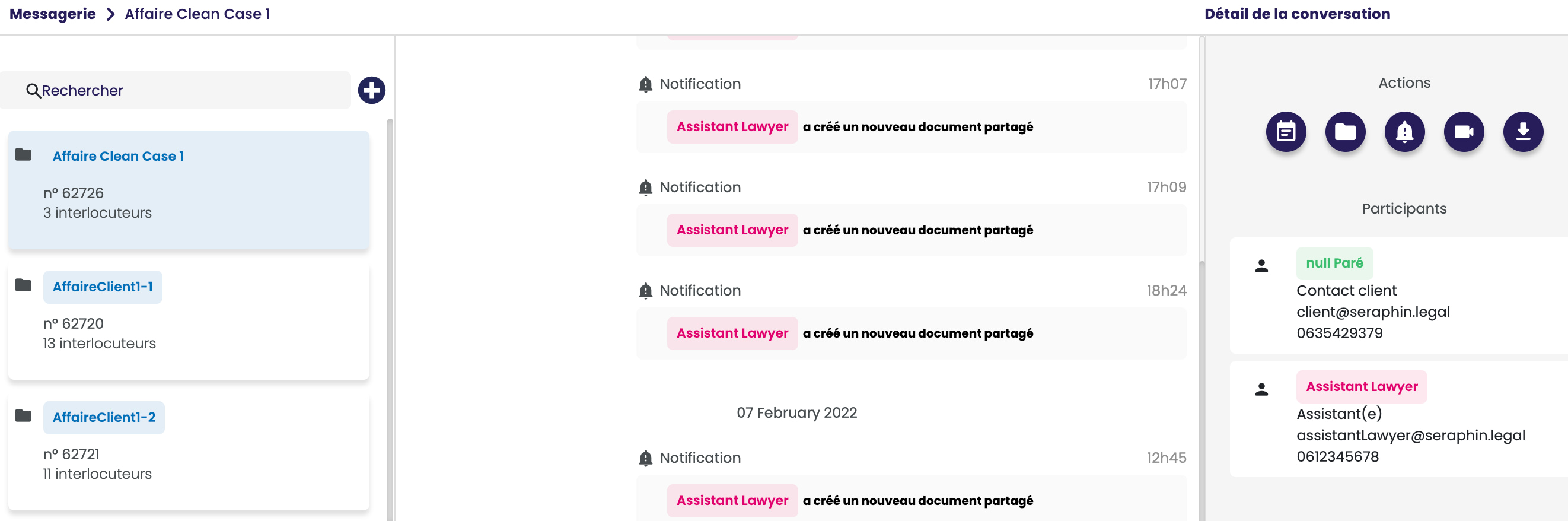 Legal Client Management permet aux praticiens de lancer une discussion entre les parties aux litiges. La solution permet notamment de partager des fichiers et de lancer différentes conversations, par exemple pour préparer une séance de médiation ou d’arbitrage, par exemple.
