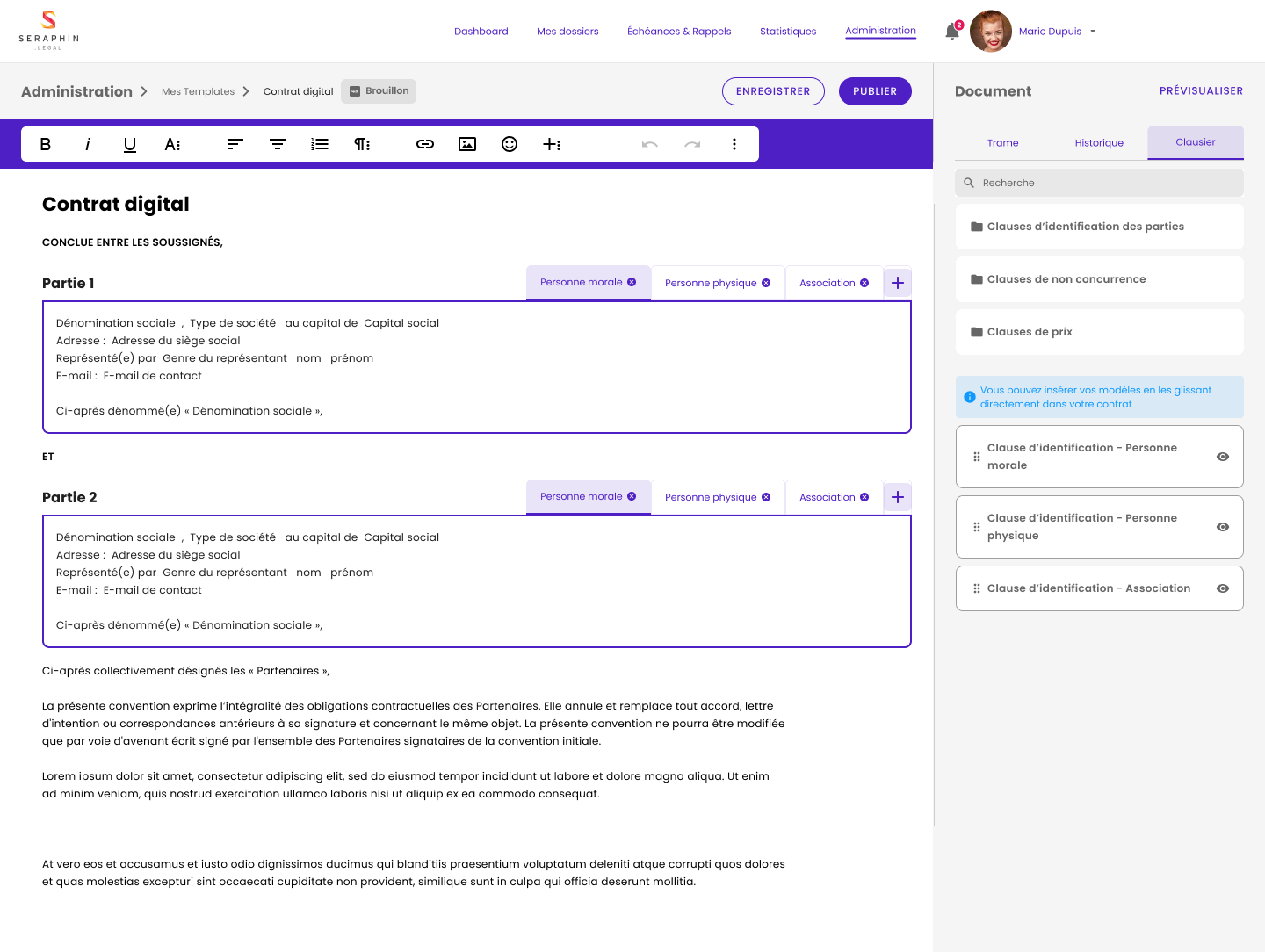 La gestion RH nécessite souvent la création de nouveaux documents pour chaque salarié. Afin de garantir des données personnelles à jour lors de leur génération, notre solution CLM se connecte à votre SIRH ou permet d'intégrer votre registre du personnel directement dans la plateforme, facilitant ainsi l'autocomplétion des documents.