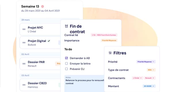 La gestion d'un contrat RH implique de nombreuses échéances nécessitant des décisions et actions concrètes. En convertissant les contrats RH en données contractuelles, nous vous offrons des tableaux de bord et des alertes calendaires pour suivre tous les événements clés de la vie du contrat (fin de période d'essai, date anniversaire, durée du temps de travail, etc.).